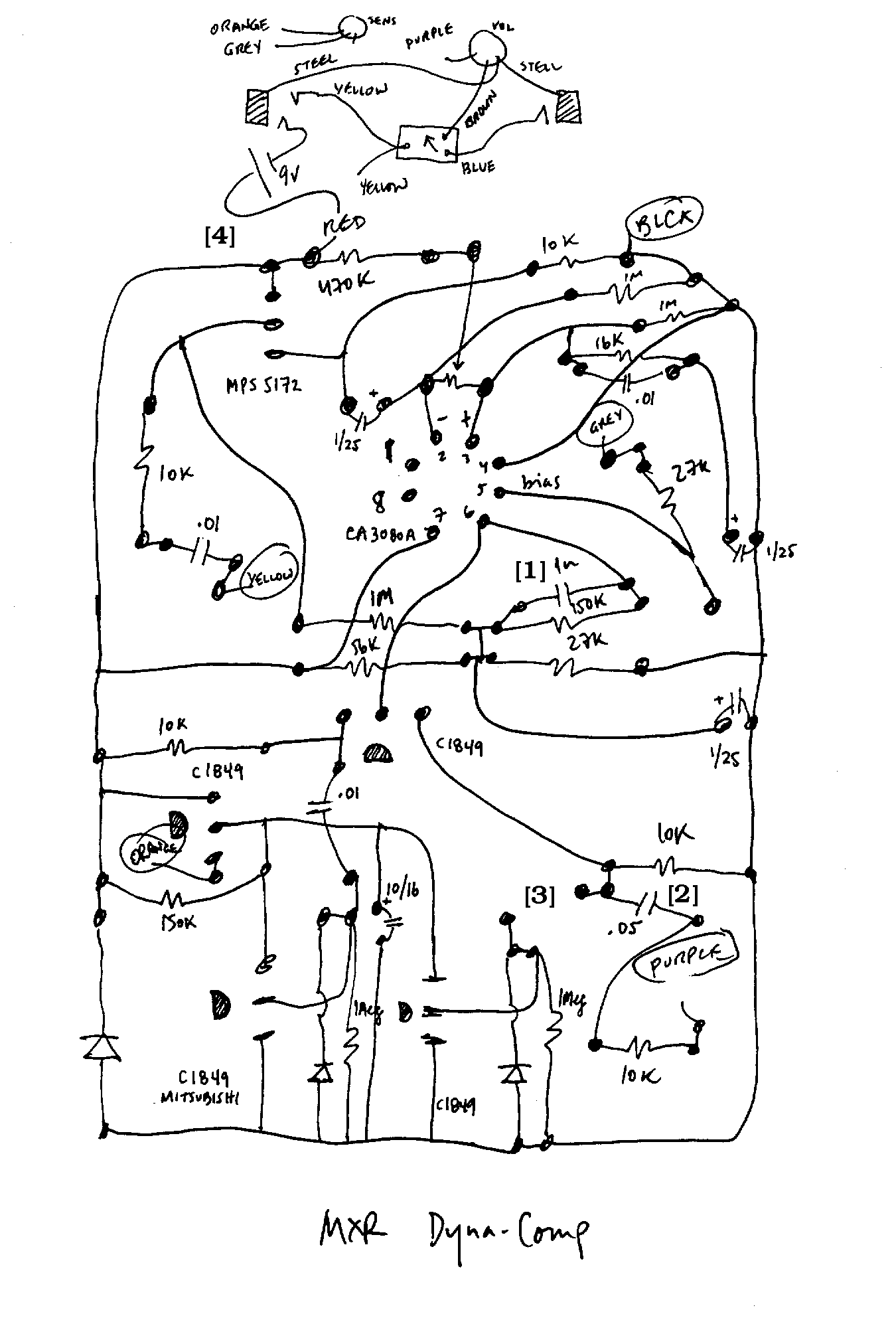 Both the top and bottom end frequency responses are severely curtailed in this MXR design - two caps affect these parameters and these both can be altered without incuring any secondary effect in the functioning of the unit ... some versions of the pedal have the second feed to the DC converter circuit operating - in my Script Logo version this feed was left disabled at the factory ... this tie-in can lead to "fuzzing" at the output when the signal amplitude gets large enough - no wonder it was disabled in some versions (check your's today !) ...